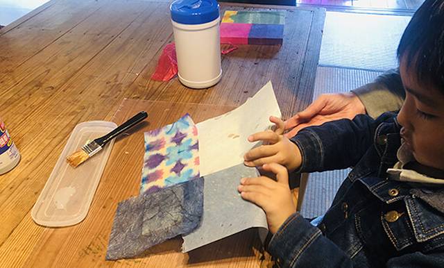 选择自己喜欢的和纸,贴在底纸上进行创作,激发孩子们的创造力。