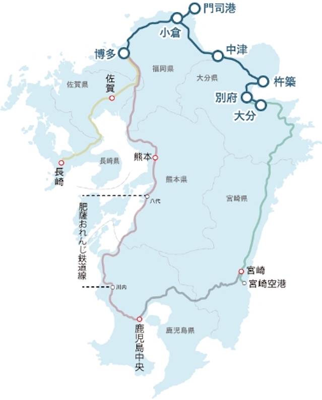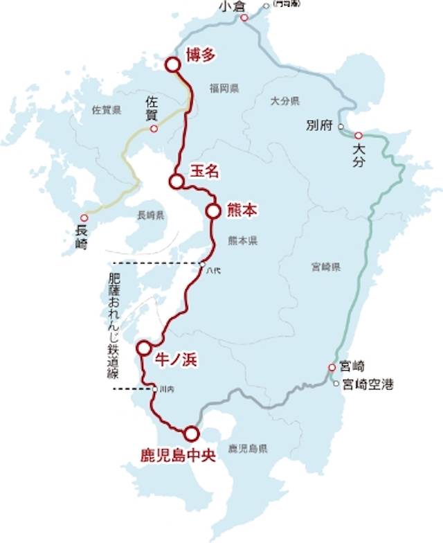 博多站 9:52开(9:58开)-11:10左右在玉名站稍作停顿(停车约20分钟)- 熊本站 11:50达/ 12:00开 - 14:25左右在牛之浜站稍作停顿(停车约15分钟) - 鹿儿岛中央站 16:24达