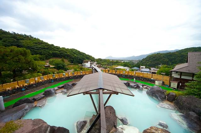 別府站旁有一座建于80年前的竹瓦温泉,情调浓郁,近似宫崎骏的《千与千寻》中汤婆婆开的温泉旅馆的风格。另外,距离別府站较远的明礬温泉、铁轮温泉也十分有名。
