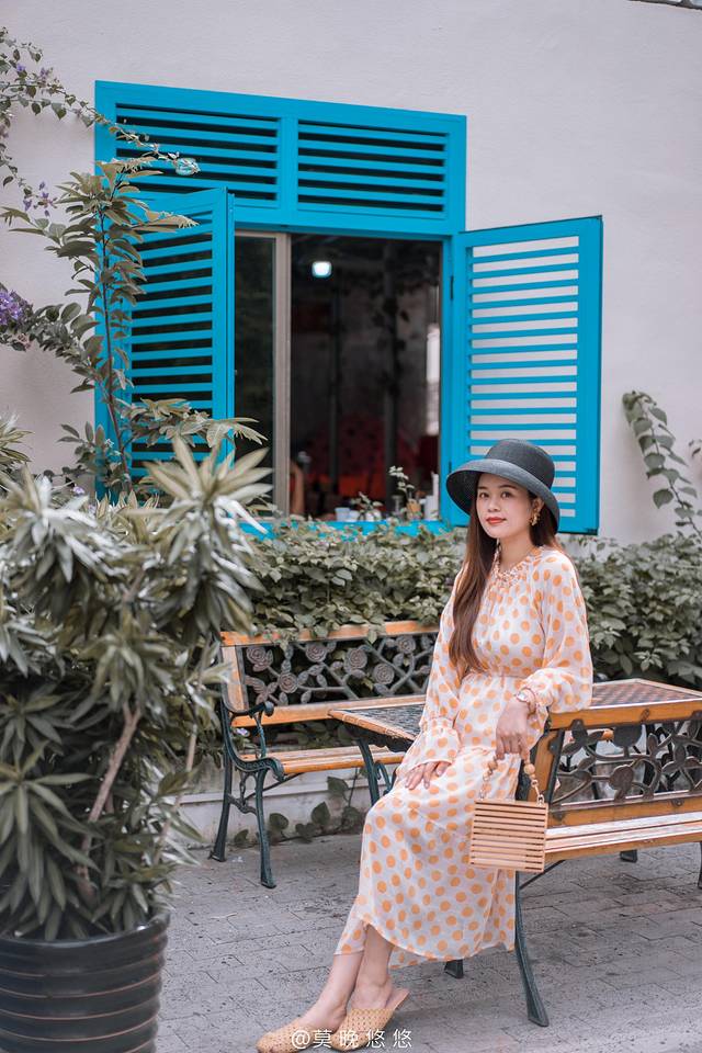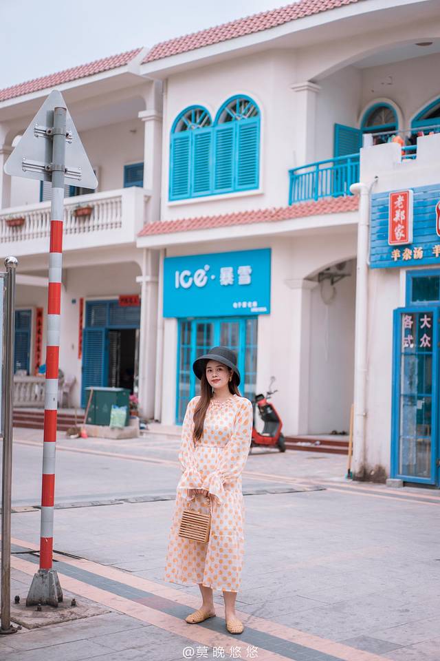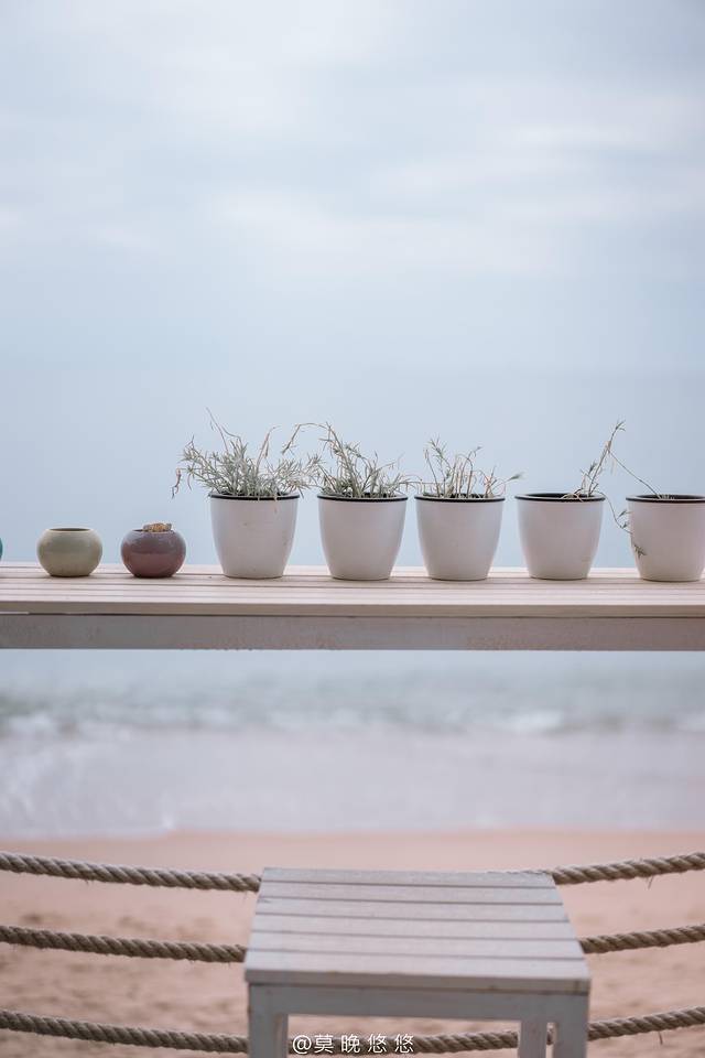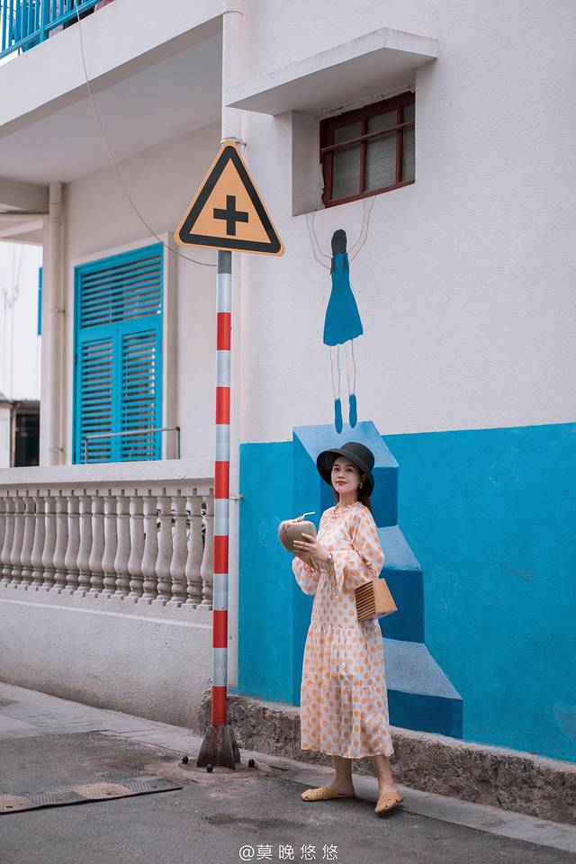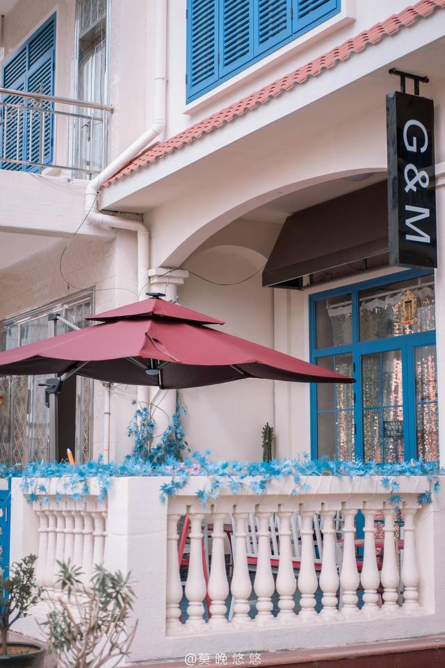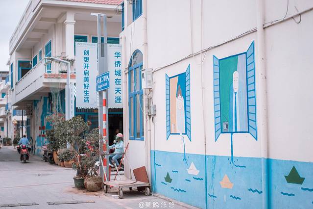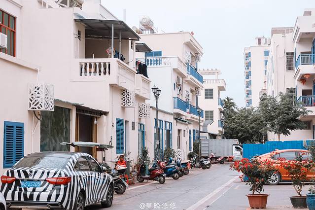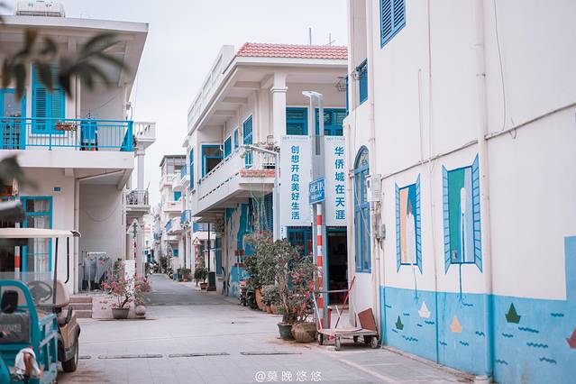 穿过街道,两边都是白色的房子,门和窗都非常统一都刷成蓝色,跟三亚的大海蓝天相呼应,行走其中,内心分分钟都被治愈了,这里俨然就是一个小型的“圣托里尼”,里里外外都充满希腊风情的浪漫。