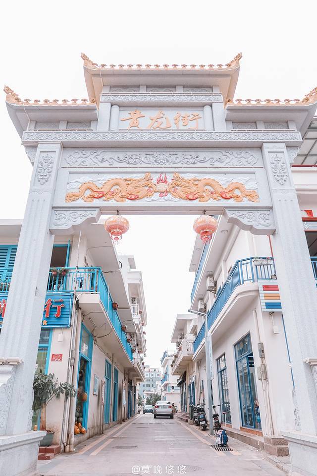 这个小镇毗邻天涯海角、大小洞天、南山寺这几大景点,可以安排成同条路线一起游玩。镇上由青龙、黄龙、白龙、红龙、黑龙这五条街道组成,每条街道都有一个大大的的牌坊,一下车就被这蓝白相间的小镇给吸引了。