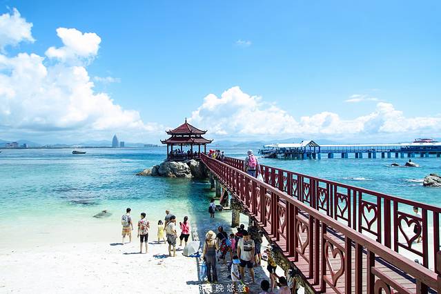 笔直的桥身,它向大海深蓝处延伸而去,终点是一个亭子,而周边都是清澈的海水,无论站在桥上还是亭子里,都可以观赏最美的海景。