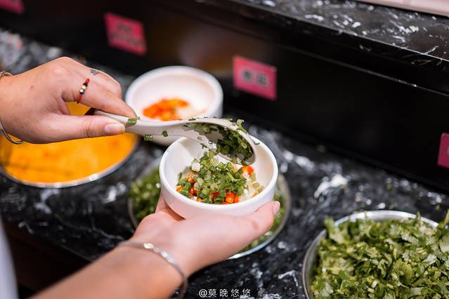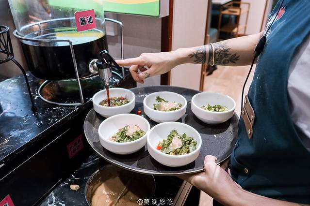 吃的时候还要蘸上特别调制的酱料,这个酱料可以根据自己的爱好来选择,也可以请店里的服务员帮忙,蘸上之后真的超级好吃!