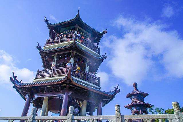 到了观光车的终点之后,我们便前往风情广场跟沧海楼。特别推荐沧海楼,沧海楼一共有三层,是南海第一楼。上了沧海楼后,就可以欣赏“天下第一湾”亚龙湾,风情真的很美,人也真的很多。