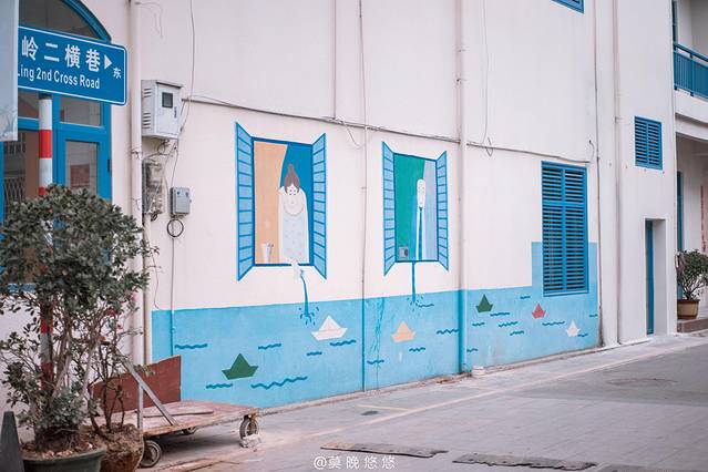 漫步在这样的小镇里,仿佛行走在童话故事里一般,随意一处转角,都可以邂逅不同的涂鸦,这些涂鸦都跟海洋元素相关,所以都是以蓝色为主色调。