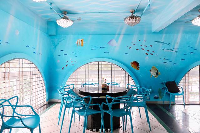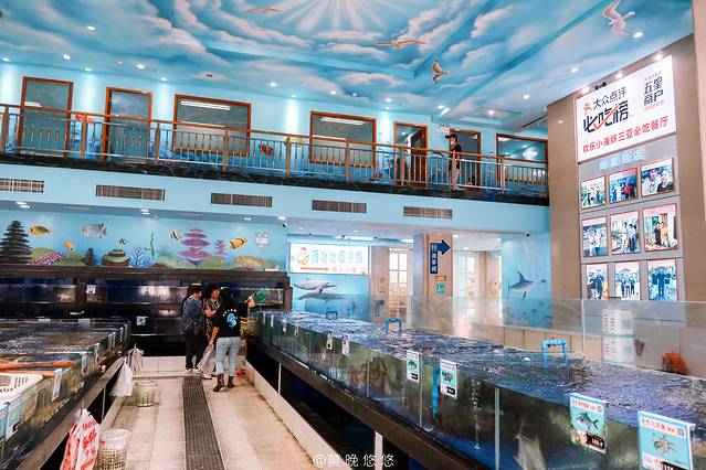 在三亚离不开的美食一定是海鲜,在三亚湾的椰梦长廊游玩的时候,总是会被小海豚海鲜广场这一栋建筑给吸引了,整个都蓝色的海洋风情,就像童话世界一样,非常地引人瞩目。而一走进来,就像走进海底世界一般,海龟,珊瑚,美人鱼壁画,随处可见。