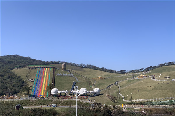 刚到达山顶时,看到的第一眼,就是那条长长的七彩滑草坪,蓝蓝的天,碧绿的草,和它配在一起,画面非常的和谐! 一眼望过去吧,感觉挺平坦的,心想着应该挺好玩,但应该不会属于刺激那一档。这一圈的路线各个玩的景点距离相对还说有些远的。所以我们若是上山晚的话,可以稍微加快些步伐哦!