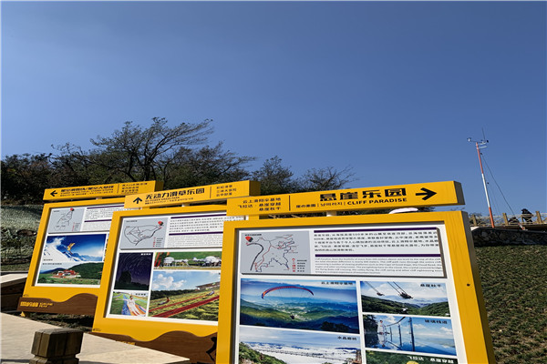 到山顶下缆车后,就会看到大厅门口有大大的黄色的景区指示牌立在面前。所以我们可以一目了然知道自己想去哪个方向。卫生间也在此处。可以顺便去下洗手间再出发哦。我当时下缆车后望着头顶的蓝天、白云,然后山顶的大致景色望眼扫了一圈。哇塞!太美了!迫不及待地想要去找七彩滑草坪和羊群啦。还有就是这景区非常适合大晴天来,因为都是室外项目,要是遇到阴雨天可能就不好玩啦。所以准备出发前记得提前查看天气预报哦。