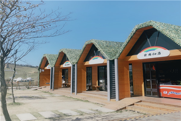 不远处就有好多间小木屋形式的小店铺,颜色形状也都挺漂亮,和四周的景象融为一体,会让你忍不住赶紧拍几个美照。吃的喝的这里都有,肚子饿了可以在这里小憩会,喝些饮料吃根烤香肠玉米等, 旁边有好几排坐位,坐着是可以俯瞰到另一边的山景的。边吃边欣赏美景也是一种享受的过程吧!