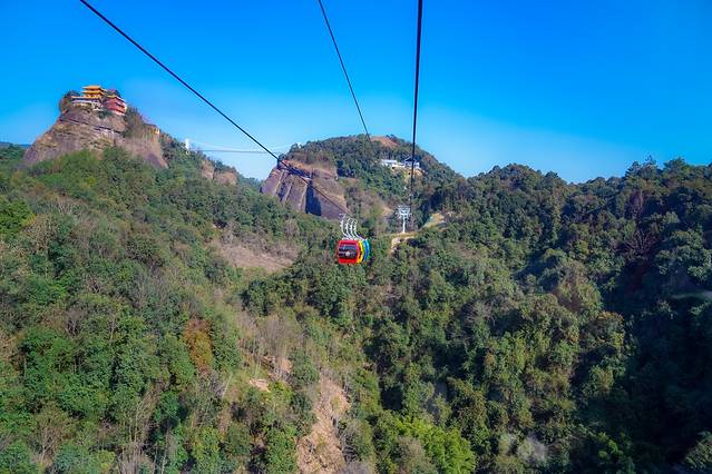 乘坐的缆车登顶,全程15分钟左右,在缆车里面也闲不住,透过车窗四周尽是旖旎山色,寒冷的冬季其他地方的山林植物大多都已经败落,而天龙山依旧挺拔珠翠,满眼都是清爽的绿色。