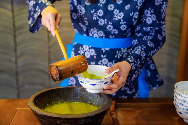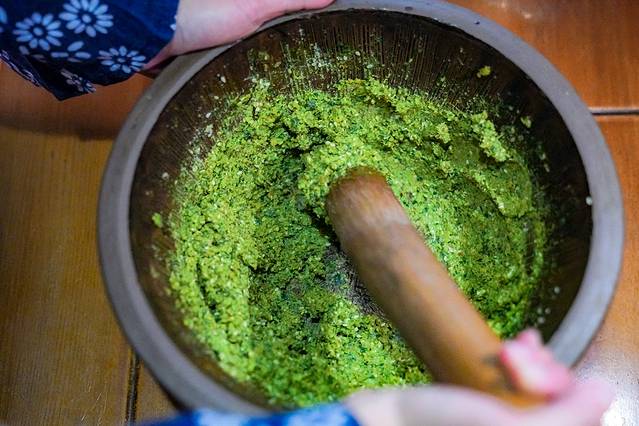 制作擂茶的基本原料是鲜茶叶、生姜、香葱、芝麻、黄豆、花生、茶叶、糯米、盐、茶油以及各种青草药,用到的主要器具是擂钵和擂杵,擂杵沿擂钵内壁反复研磨,最终成顺滑泥状,用开水冲泡,再倒入少许茶油,一钵甘润芳香、色如琥珀、清爽可口的擂茶就制作 成功 。