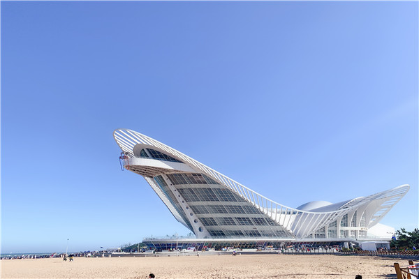 金沙滩上有一个非常壮观且奇特的建筑,它更像一只白色的巨鸟一样停留在沙滩上休憩着。据说关于建筑的色彩,曾经有过很多个选择,幻彩色、金色、火红色、白色。经过两年的酝酿,终于定稿为纯白色。虽是火凤凰,但它拥有海鸥的自由和纯洁色彩。也的确纯洁的色彩非白色莫属。远远地拍照任何角度都非常的好看。从不同角度看它,又似一只即将起飞的海鸥,即将朝大海飞翔而去。