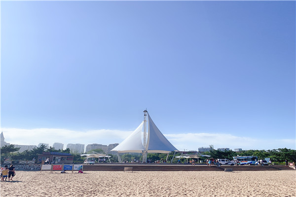 这里的青岛金沙滩位于山东半岛南端黄海之滨,青岛市黄岛区的凤凰岛。南濒黄海,呈月牙形东西伸展,全长3500多米,宽300米。金沙滩水清滩平,沙细如粉,色泽如金,海水湛蓝,水天一色,故称“金沙滩”。金沙滩是我国沙质最细、面积最大、风景最美的沙滩,号称“亚洲第一滩”。2008年底还被评为AAAA级景区。