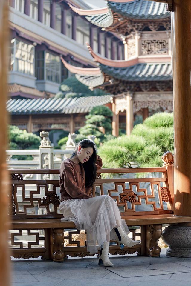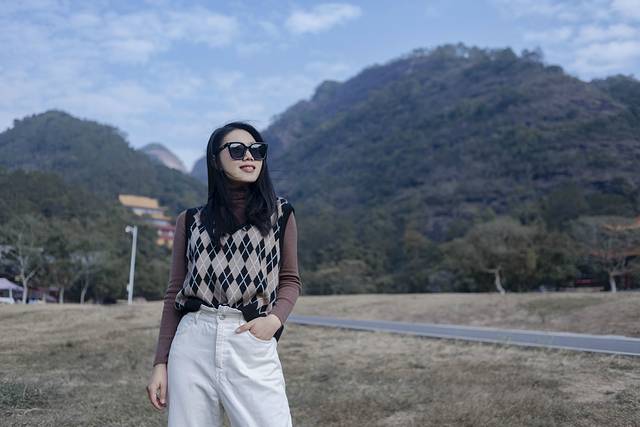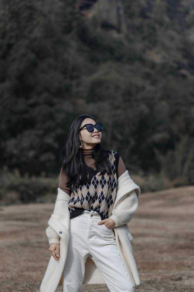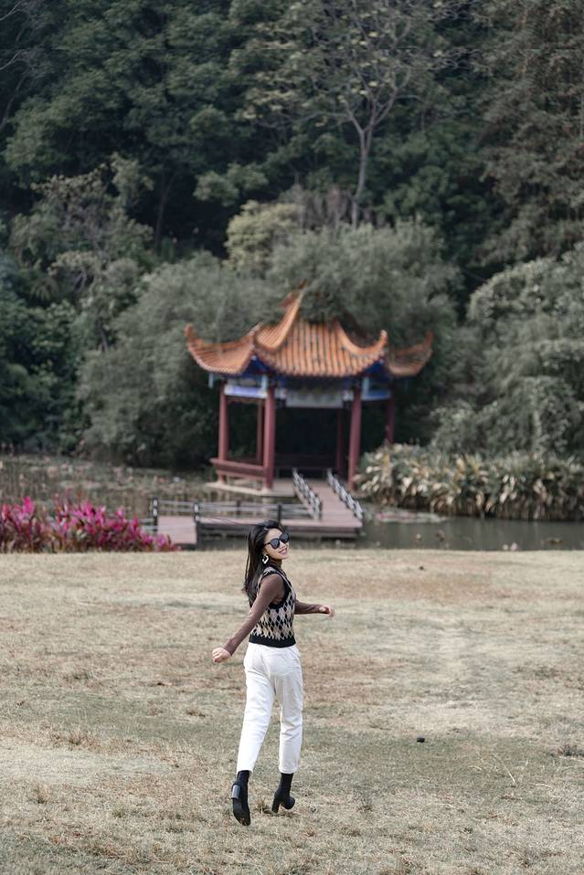 如果站着不自然,那就坐在草坪上,寻找让自己自然好看的方法,更何况在风景的加持下,拍出大片范儿也不难。