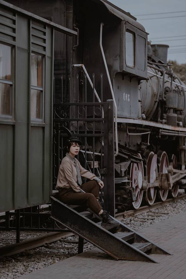 拍照位置:民国式建筑拱门前,绿皮火车候车区域,铁轨上,铁轨旁信号灯,火车头