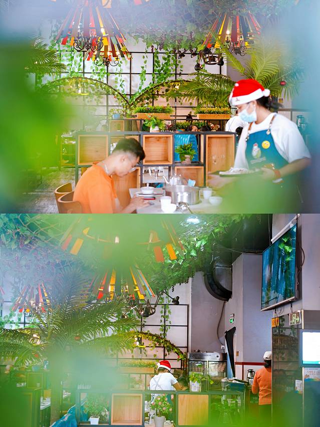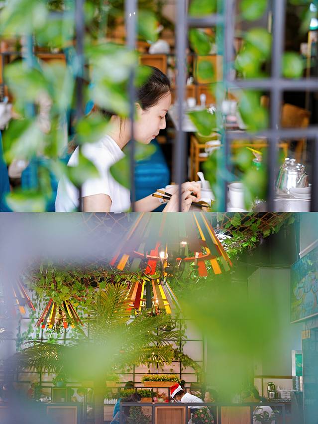 环境:椰树点缀着餐厅,开放式结构通透明亮,清新田园ins风格。
