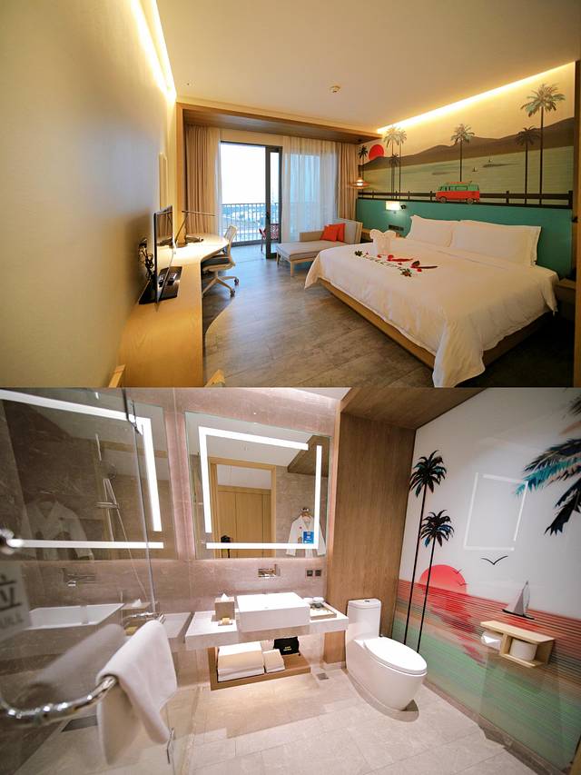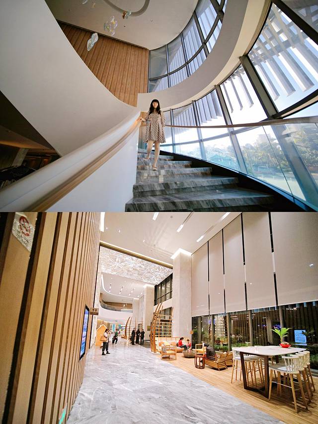大堂入口延伸了渔船的造型,主题墙的光影变幻着椰树的纹样,螺型旋转楼梯上飘荡在空中的“贝类海洋生物”,电梯厅阔叶植物和热带花卉印衬在“冲浪板”上,地毯上奔流的波浪,房间提示灯上的鸡蛋花图案,酒店细致地将海南岛美丽的自然景致、独特的植物融入设计,为人精心打造一个海岛度假天堂。
