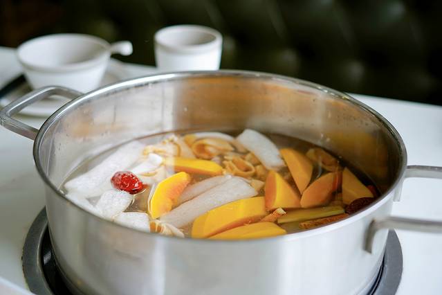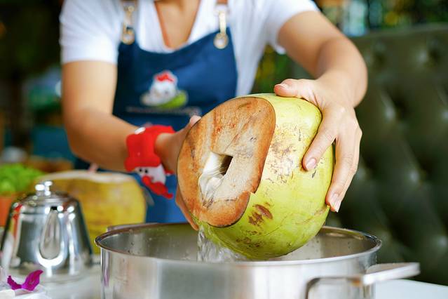 木瓜花胶椰子鸡:三只新鲜的大椰子入锅,有着“百益果王”美称的糖心木瓜软糯香甜,来自南海海域的特选花胶富含高级胶原蛋白和多种微量元素,养足150天的海南文昌鸡鸡肉鲜嫩不腻。锅底加入了海椰皇和五指山毛桃提味,鸡汤椰香浓郁更好喝。这一锅美味,简直是美容养生色香味俱全。