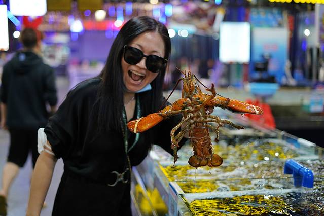 亚龙湾壹号小镇·奥特莱斯量贩海鲜加工广场是这里的一大特色,来到海岛城市,自然要品尝这里的海鲜。进去以后,首先看见的是广场中间的巨大回字型海鲜挑选区。隔着透明玻璃柜子,各式鱼虾螃蟹活蹦乱跳,品种非常丰富。游客在这里随心挑选,一切尽在眼底下,透明消费,不用讲价还价。