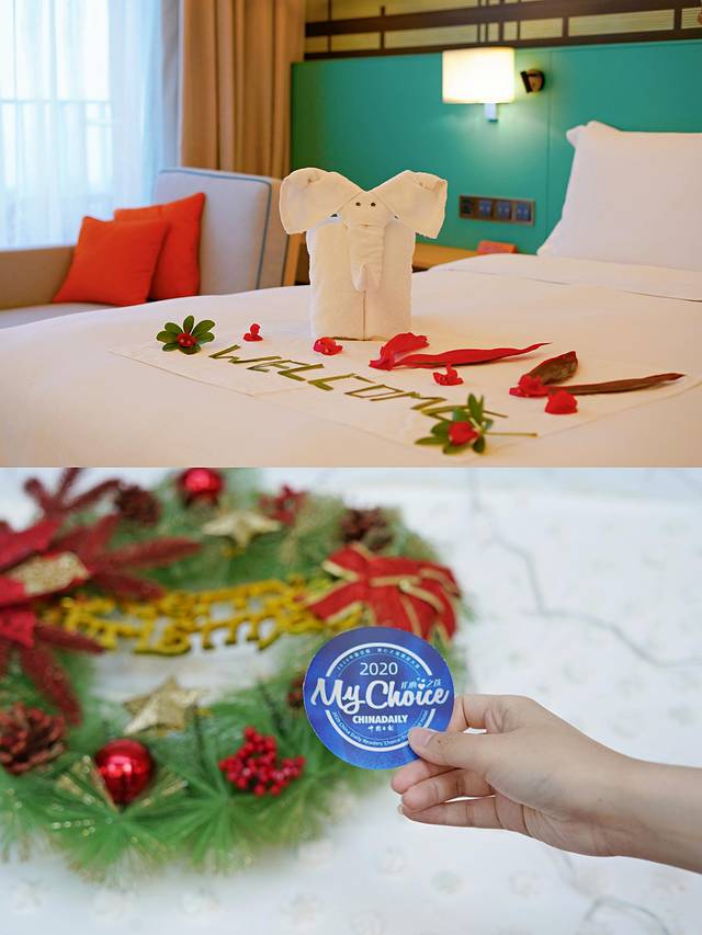应中国日报2020我心之选酒店大赏活动的邀请,入住三亚希尔顿花园酒店。恰好赶上酒店成立两周年店庆及圣诞晚宴活动。办理入住时前台还送了平安果,大堂内处处体现着节日的氛围。