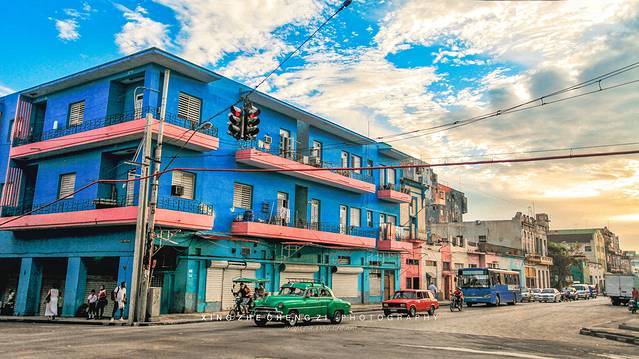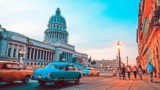 这张图片呢是我在哈瓦那国会大厦的对面拍摄的,当时正好是太阳落山,天空中的光线从冷色到暖色渐变分布。在我旁边,有一辆临时停在路边的复古出租车,马路中间,也有一些呼啸而过的汽车,一动一静形成了鲜明对比,我特意把快门速度压慢到手持拍摄不至于虚掉的参数,大概三十分之一秒,这样呢,就拍出了这张青橙配色的图片。