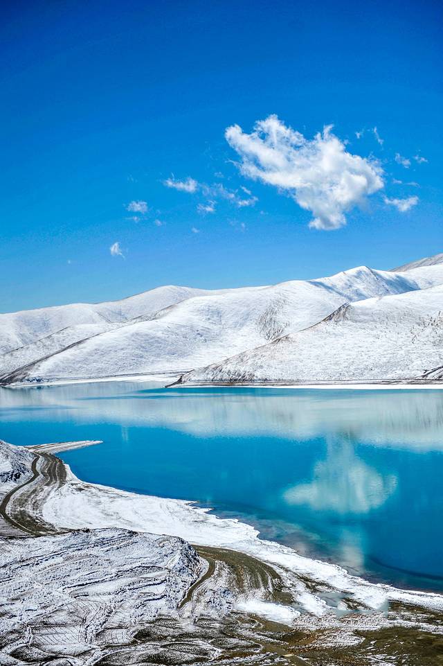 冬天羊湖冰封,似素衣美女横躺在喜马拉雅群峰的怀抱里