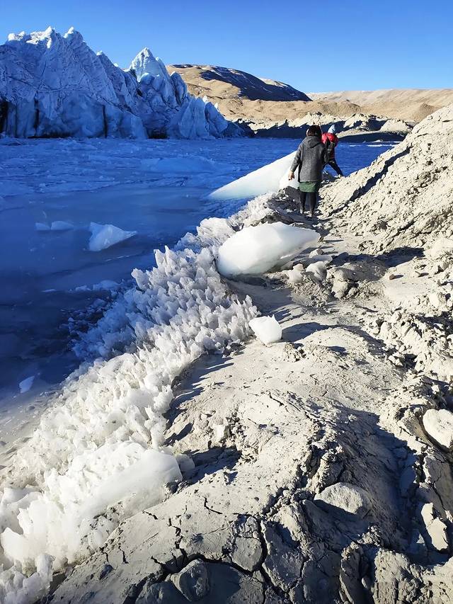 40冰川其中一段没有道路、没有路标、有的只有高低起伏的碎石路,所能依靠的就是司机的方向感,师傅一路照顾着我们, 终于停在冰川下的一个冰湖旁,但需要步行一个小坡,大概三公里