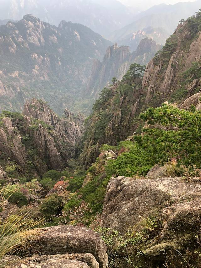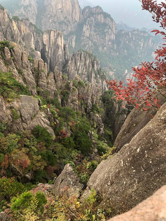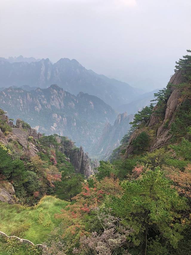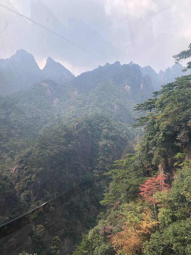 黄山小时候来过一次,只记得很美,但只是走马观花。这次好好地走了一次,真心好美,倚在山顶的扶栏上,看着山间的绿树红叶黄叶怪石苍松碧水,忘记了近日的烦忧,要是能永远待在这青山绿水间真是太幸福了。看那云卷云舒、日升日落、风起风息,看那花开花谢、草长草黄、树长树倒,从容淡定。。。