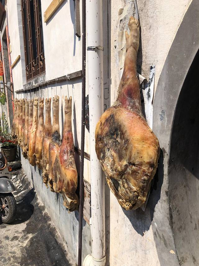 早上睡到自然醒,在一家叫得月楼的饭店吃早午饭,味道不错。在宏村逛逛,阳光超级刺眼,映的景色特别漂亮。蓝天灰瓦白墙绿叶荷花碧水,每一张照片都是一副山水画。每一家的墙上都随意挂着超大火腿,看着就垂涎三尺。