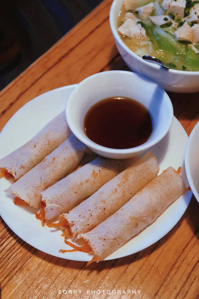 他们家超级有名的手工薄饼也必须点上一份,薄饼用面做饼,以花生碎等为馅,薄饼夹着这些馅料吃,同时蘸着醋,妈耶,口感也太好了吧,白糖沙沙的、每口都有一种吃雪的浪漫感觉!