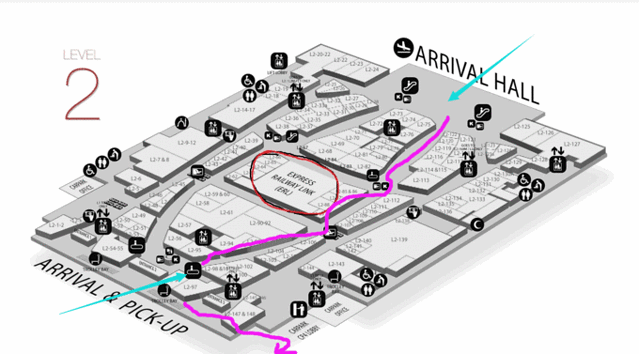 放张示意图给大家吧,到达厅上来就是的蓝色箭头位置,就可以看到商店区的入口手扶电梯,下去