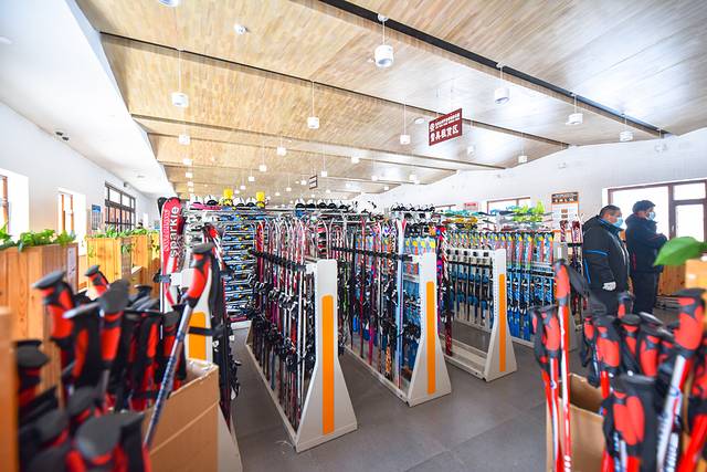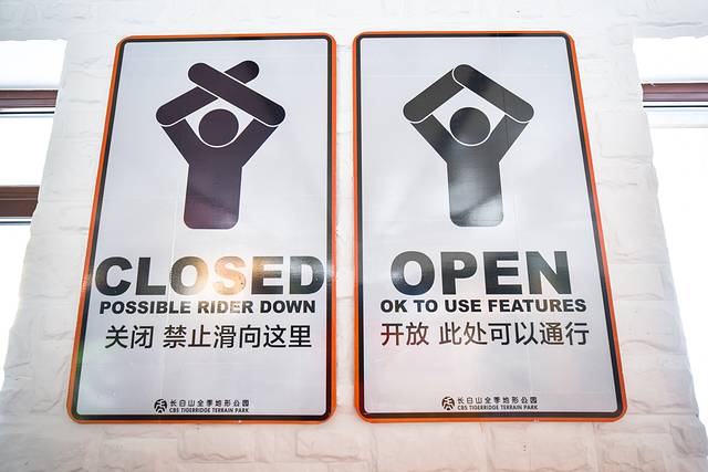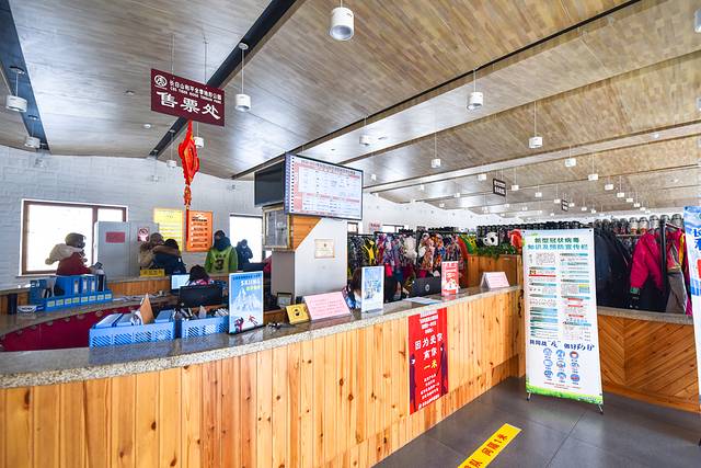 对于滑雪小白而言,这儿也是最好的课程体验基地。进入景区,有一些标识,必须了解。选择合适雪具(雪帽、雪镜、雪鞋、雪板)以及防护工具,然后寄存行李、更换装备,携带计时卡片,进入雪场内部。