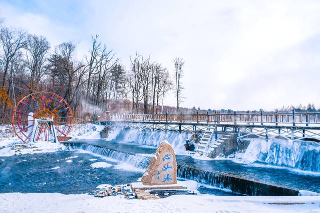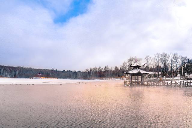 夜幕之下,五彩斑斓的汤池夜景,十分迷人。不过说到聚龙泉,你要知道——聚龙泉温泉带,泉外雪花飘飘,泉中热气缭绕。远远望去,温泉腾起一片云雾如是长白山的神秘面纱。出水温度达到82摄氏度的聚龙泉,几乎供应着二道白河镇上所有的酒店温泉用水