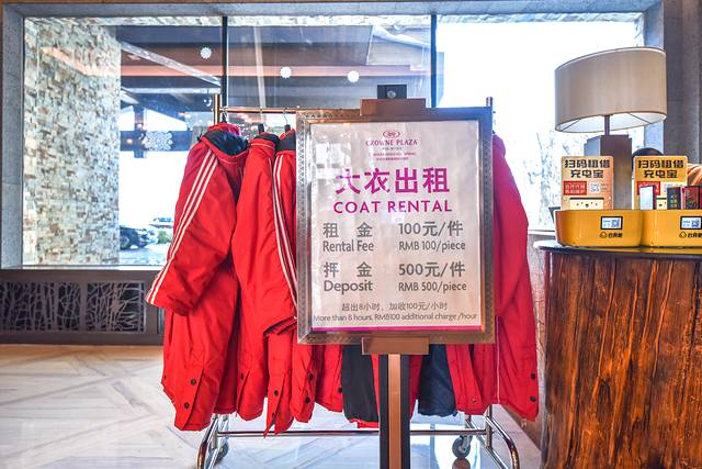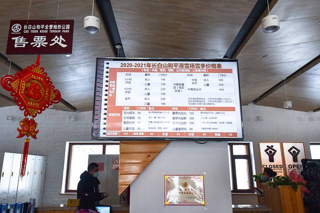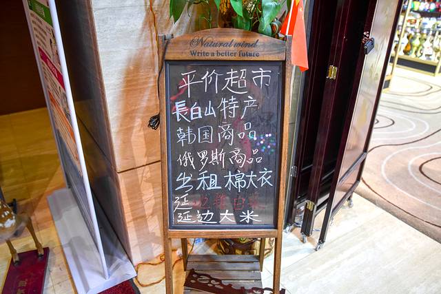 在长白山选择餐厅,这个灯箱标志,就是你放心之选。对了,没做好抗寒准备的朋友,可以在对面的商城购买羊毛裤、护膝、帽子等用品