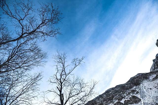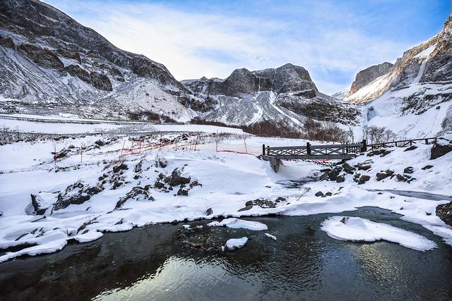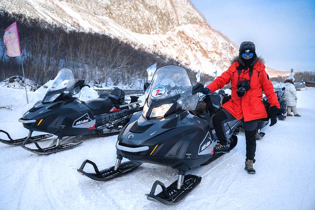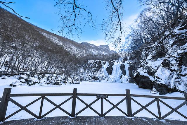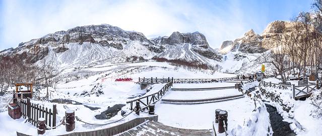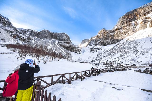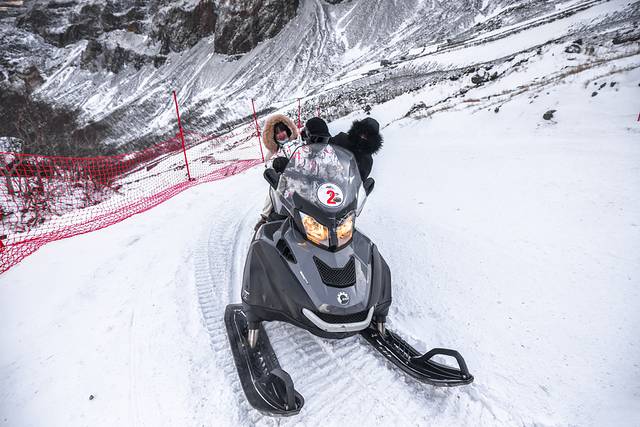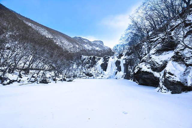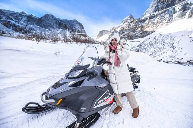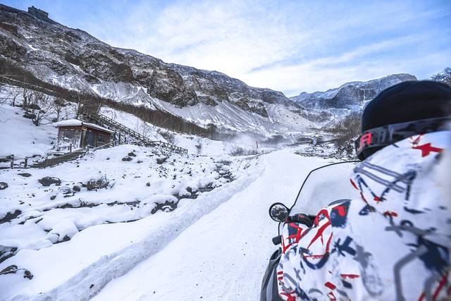 一路驰骋在冰天雪地之间,这种如入无人之境的独特体验,别提让人有多兴奋,那种心情无以言表。乘坐雪地摩托,翻山越岭,驰骋山麓雪道后,才能亲见这一胜境。山脉在阳光照射下,线条硬朗,向光处山石裸露,背阴处仍是白雪皑皑。夏季瀑布以及水潭颜色比蓝天更蓝,冬季显得黝黑,却更有原野秘境之感