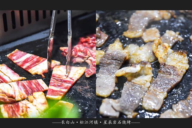 来到长白山第一晚、第一餐吃什么?不如感受一下焦香诱人、色泽金黄、肥而不腻的韩式烤肉吧。这家位于抚松县松江河镇上的星辰岩石烤肉,可是镇上美食第一名哦!饭点时刻,全店满座。它选用长白山火山岩,烤出自然健康的味道
