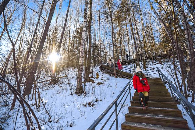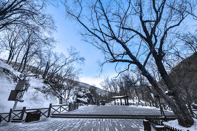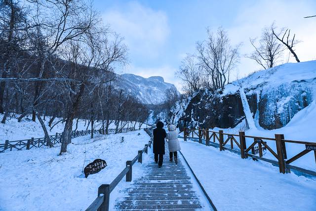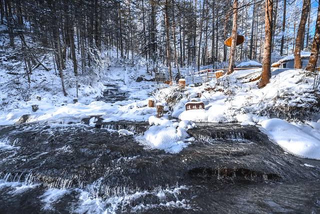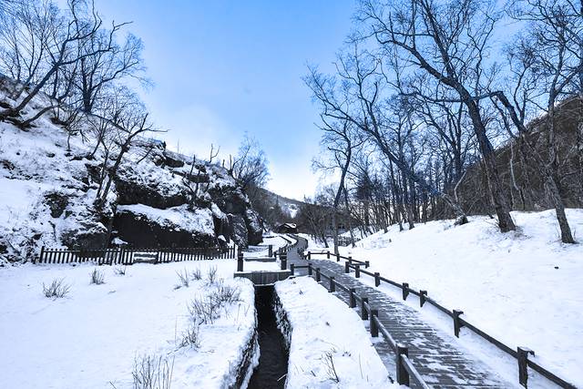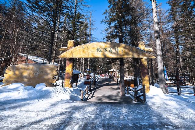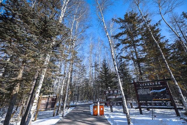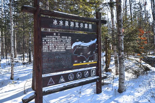 景区古木参天,栈道逶迤,斜阳灿烂,泉水叮咚,鸟儿掠过林海,非常静谧安详。景区入口在右,迎着栈道可往下抵达冰水泉溪道,在品尝完冰泉火锅后,再拾阶而上,迎着阳光,回到景区出口。全程无须走回头路,爬山也不累。冰泉处,还有一棵百年树根冰雕,比雾凇更震撼。