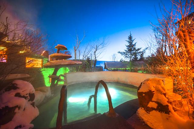 酒店与天池汤泉仅一门之隔,住店客人,可房中更换衣服,直接进入露天泡池。夜幕之下,五颜六色的户外汤池景观,很唯美。室内外温差很大,将近50°,所以泡在42°池水中,头发眉毛都结霜了。这种冰火两重天的体验,绝对难忘。汤池有10个之多,双人泡池,多人汤池等。长白山是由于欧亚大陆地壳运动而形成,天然的温泉,矿物质含量非常高。