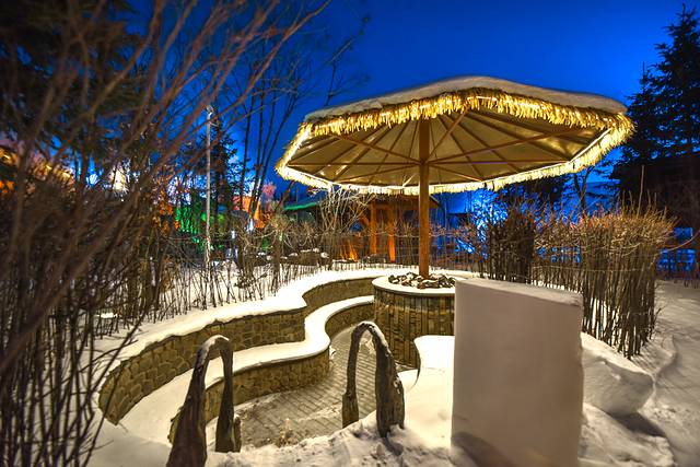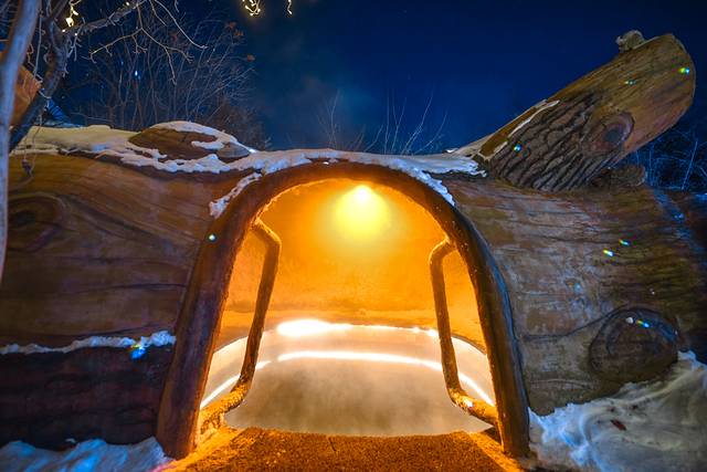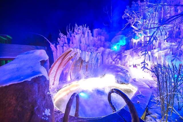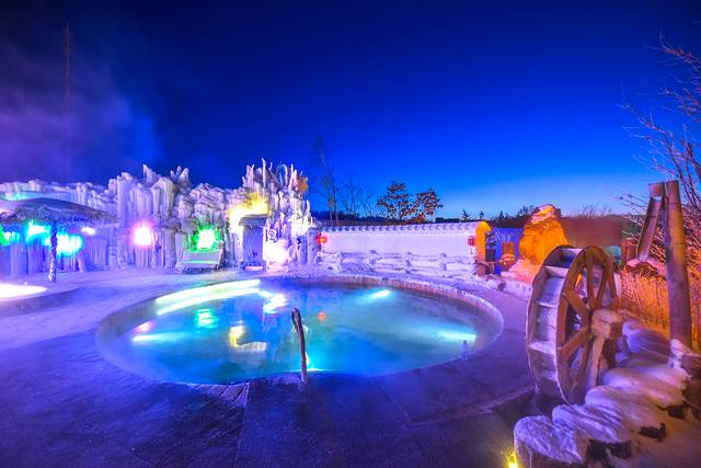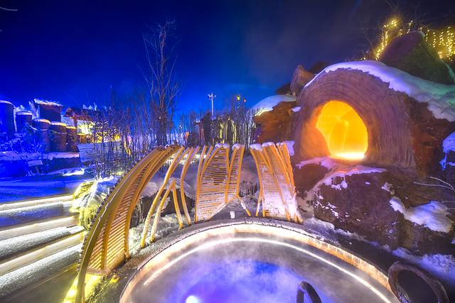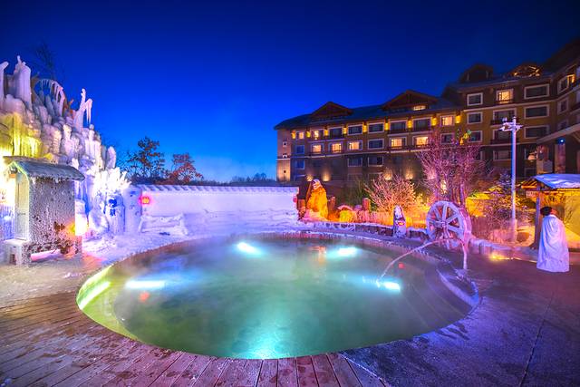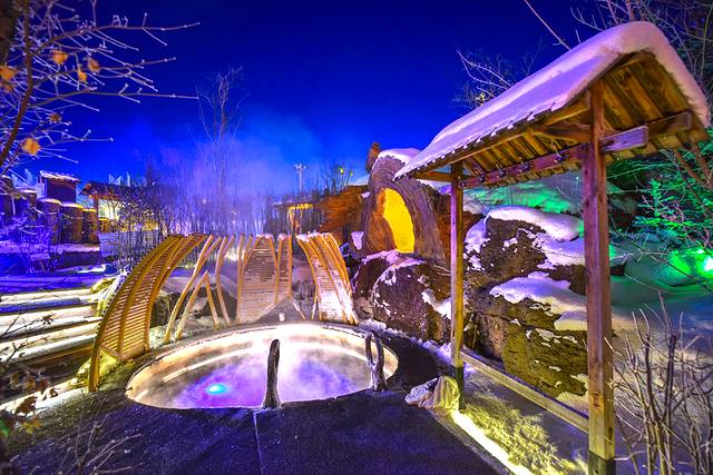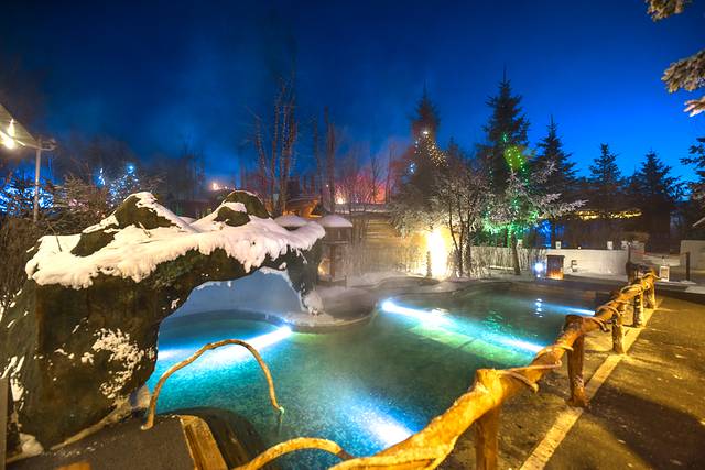 酒足饭饱,下榻长白山温泉皇冠假日酒店,最吸引人的并不是宝藏度假酒店,而是天然温泉水、长白山第一温泉“聚龙泉”温汤。迫不及待,参观一下这冰火两重天的户外露天雪景汤池。