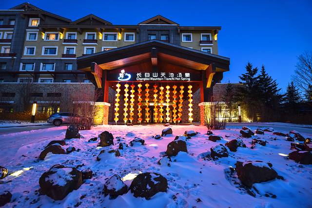 长白山金水鹤温泉国际酒店位于安图池北区通场路,近白山大街,地处风景秀美的长白山脚下,毗邻美人松苑、美人松雕塑公园等景点。酒店主楼总面积约3万余平方米,外观时尚大气,内饰豪华雅致。客房舒适宽敞、色调柔和,房型种类多样,酒店内部采用供暖,因而不冷,第二天也不会上火。放下行李,出去觅食~17点就天黑的长白山之夜,只有唯美食不可辜负哟~此外酒店也配备温泉体验。