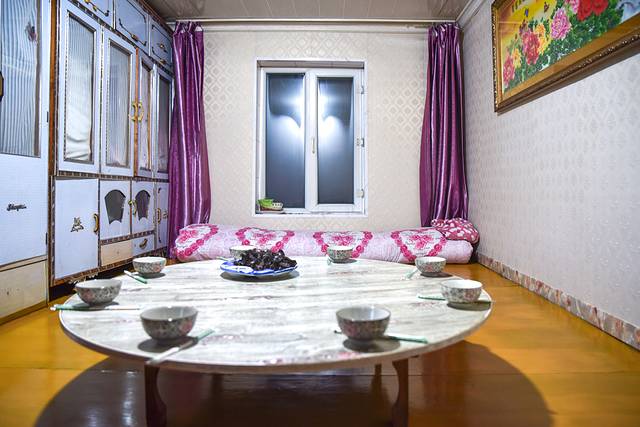 在东北林场,自家烧炕,那房屋以单层为主,一来防风保温、二则烧炕容易,早上烧,热乎一整天。房间不大,家具也精简,这就是与南方不同。大小2个炕头,大炕头就用来招待团队用餐客人。