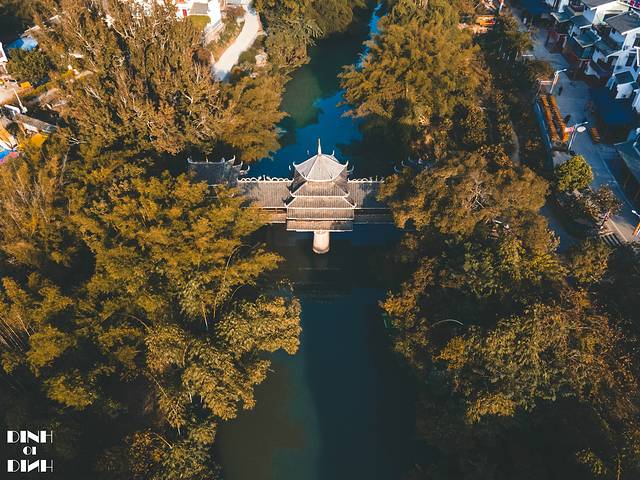 从高处俯瞰榕湖,一座形似 北斗 星排列的桥连接着岸 边和 湖心岛。桥形布局走向按 北斗 星分布,用汉 白玉 打造,因此称为 北斗 桥。