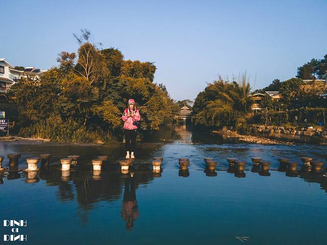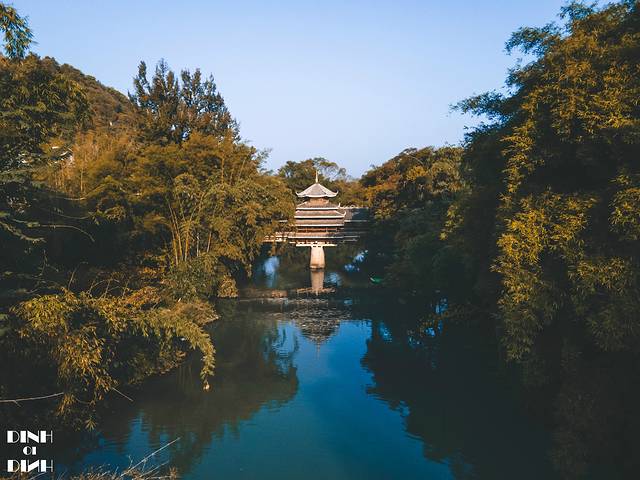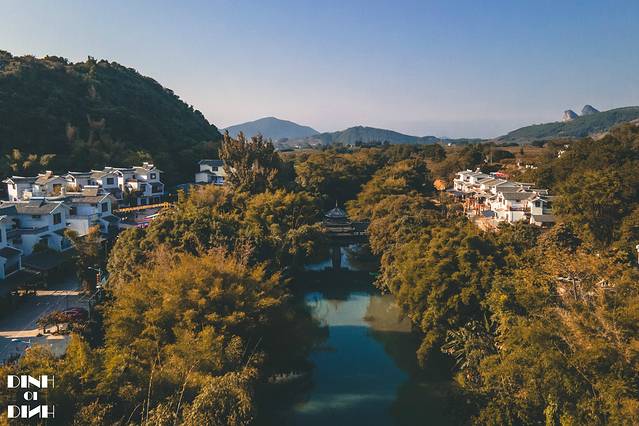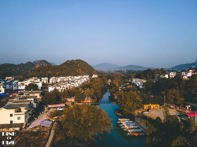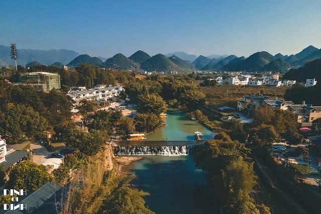 在空中俯瞰,滚水坝两边的水位高低相差1-2米,碧绿的河水在村前流淌。在 广西 总是能见到这样碧蓝的流水,总说 广西 的山水好风光,这可是名不虚传的。水坝上游还有游船,可以乘船游览两岸风景,早上的时候看,碧水就像一面镜子,游船行驶水面拉开了一道水痕。