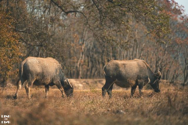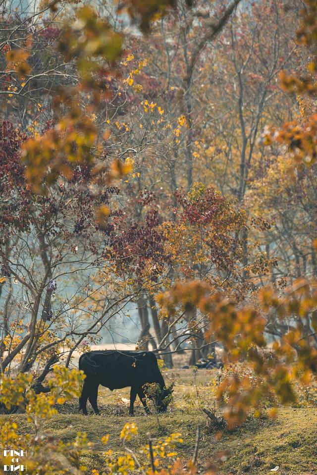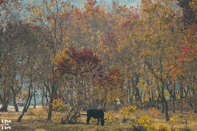 好在发现一片还挂着叶子的小树林。一头小牛在这里悠闲的吃着草