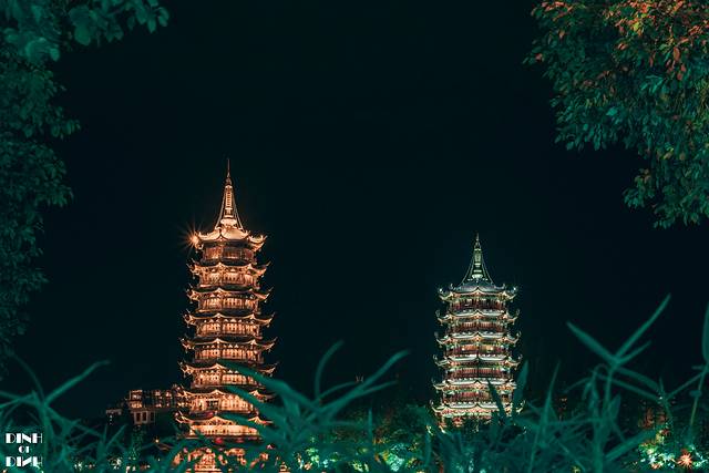 可以说,步行游览两江四湖的日月双塔这里是最精华的部分。日塔高41米共九层,通体均为纯铜装饰,整座铜塔创下了三项世界之最——世界上最高的铜塔,世界上最高的铜质建筑物,世界上最高的水中塔。 月塔高35米共七层,为琉璃塔。