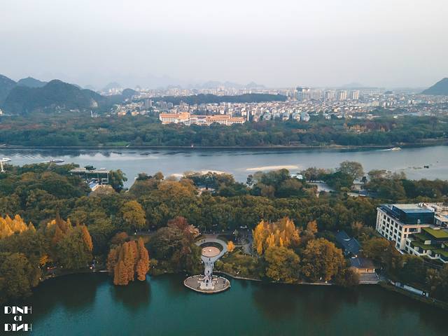 杉湖的背后就是漓江,漓江的背后就是訾洲岛咯。以整座岛都是生机勃勃的绿色点缀着红黄。