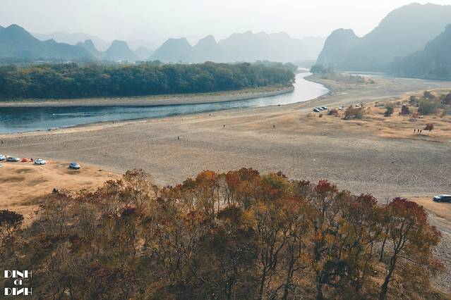 空中俯瞰,因为冬季的漓江水位下跌,大片的河滩露出来,原本是一个江中小岛的乌桕滩,已经可以从岸边步行上岛了,很多自驾来的车子也直接开到了岛上。