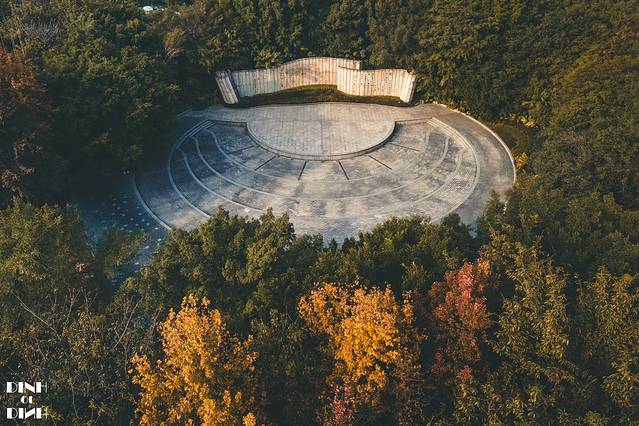 杉湖的观景台是一个琵琶的造型,空中俯瞰,就像是被五彩的丝带包围的一把琵琶。