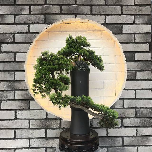 在一家店门口发现了一棵松树配上后面的砖墙觉得很有艺术感忍不住拍下来,没摸过不知道这树是真是假。