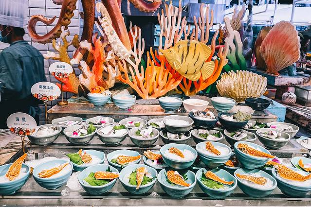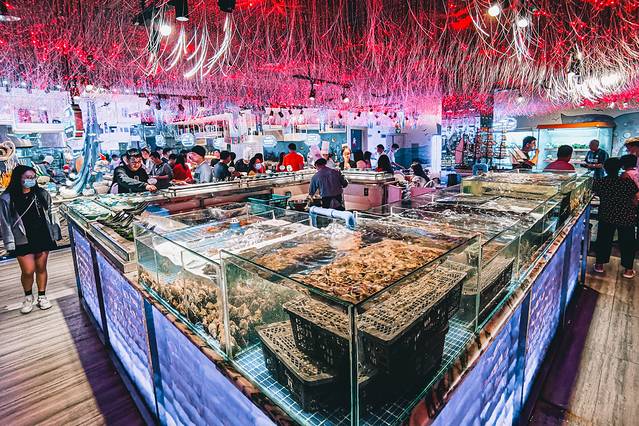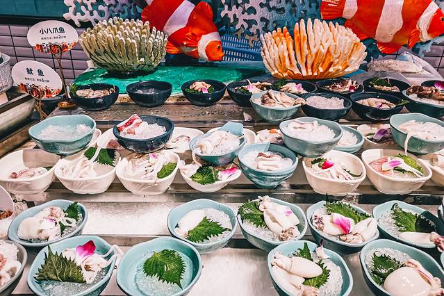 作为一个特别能吃海鲜、又心疼钱包的人,所以我把眼光瞄向了性价比高、餐品质量又好的海鲜自助餐厅,选择了大东海区域的1号港湾城的大悦洋海洋海鲜自助餐厅。